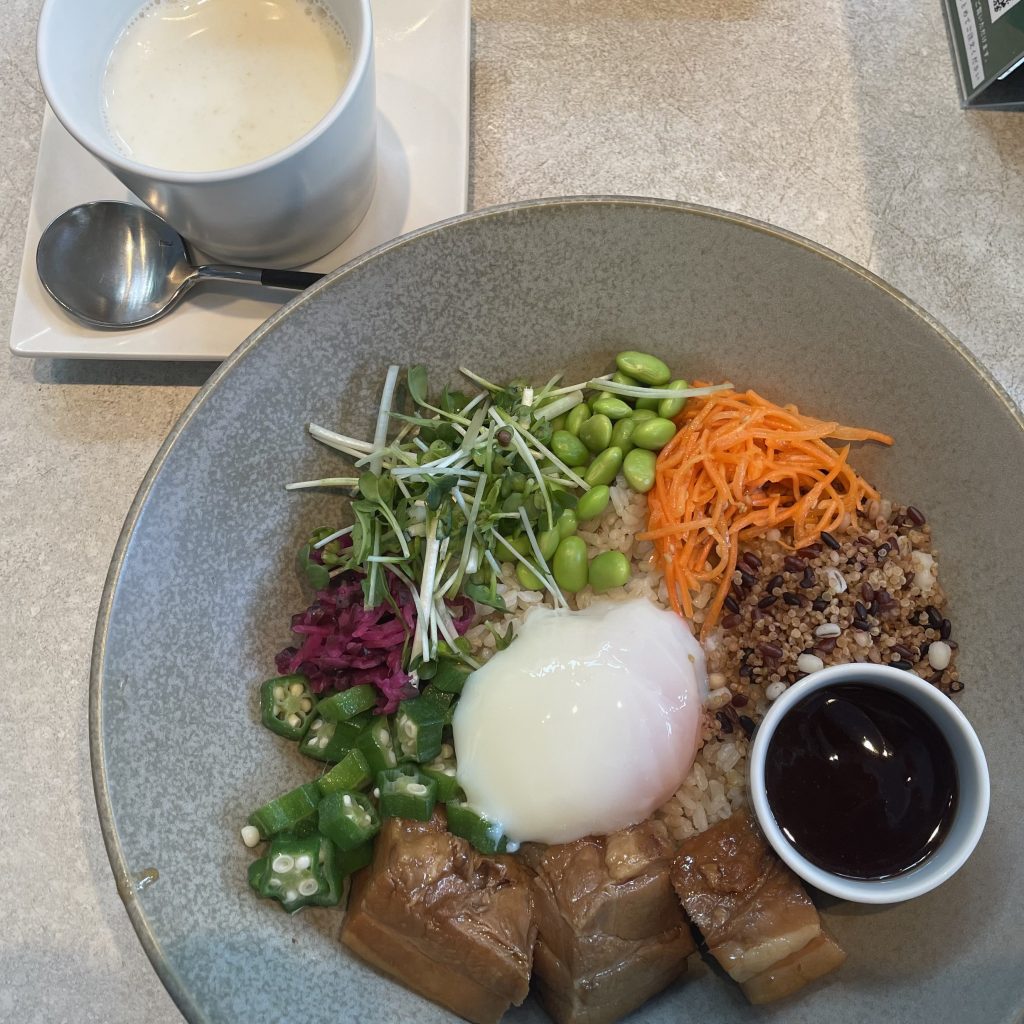 豚の角煮と温泉卵のどんぶり 黒酢あん添え